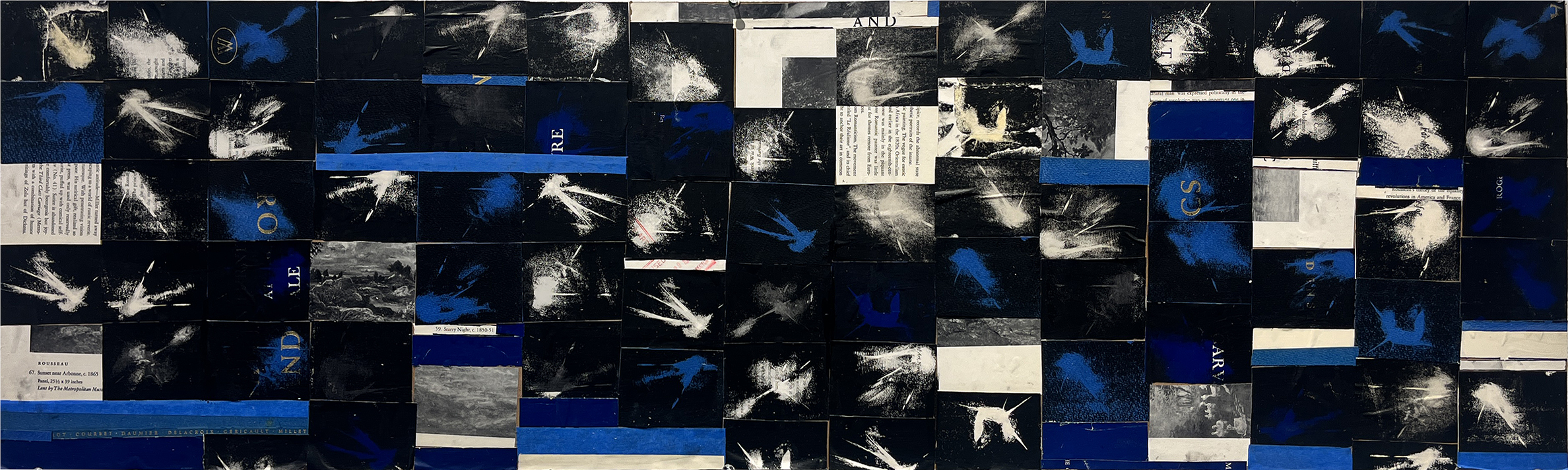 , Collaged lithographs printed on found paper, paper scraps, and tape on masonite